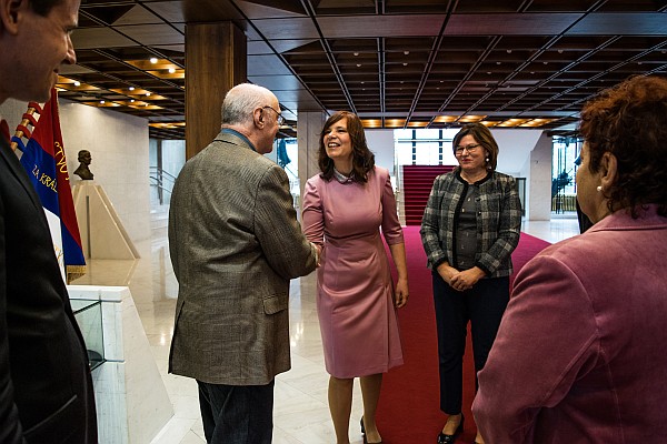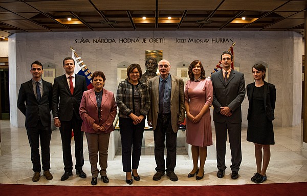 Pavel Litvinov sa v Národnej rade stretol s poslankyňou Veronikou Remišovou (napravo od Pavla Litvinova) a predsedníčkou parlamentného výboru pre ľudské práva Annou Verešovou (naľavo od Pavla Litvinova)